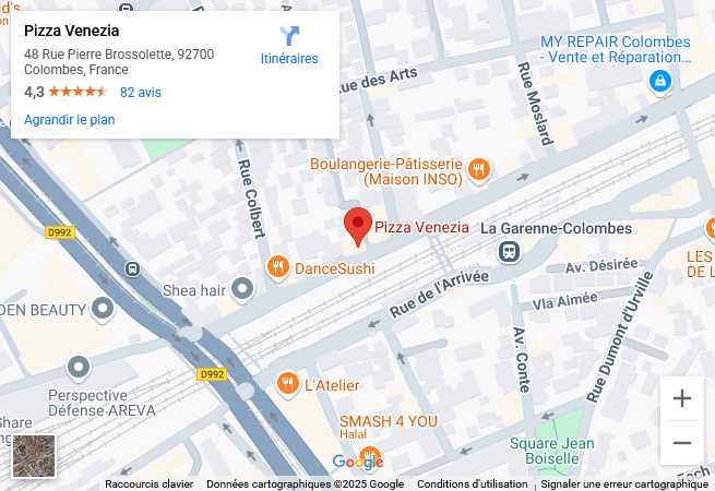 Pizza Venezia +33 1 47 86 30 09 48 Rue Pierre Brossolette, 92700 Colombes, France. Sur Google Maps